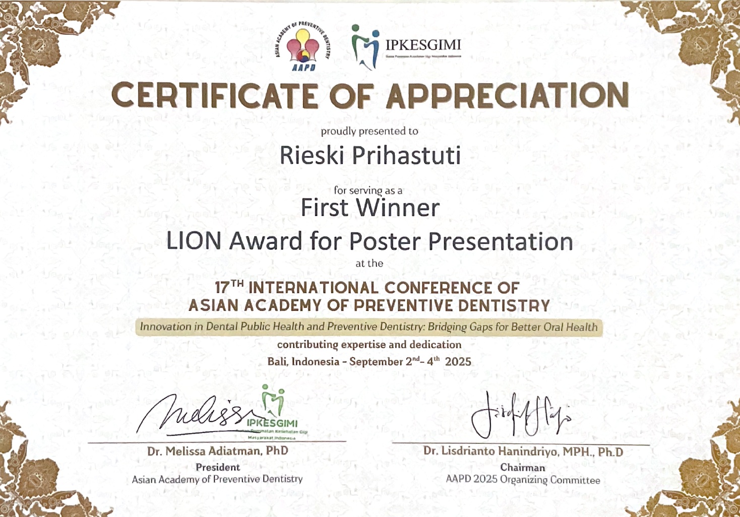 | International Conference of the Asian Academy of Preventive Dentistryにおいて、Rieski Prihastuti先生がFirst Winner in the LION Award for Poster Presentationを受賞しました。Dr. Rieski Prihastuti received First Winner in the LION Award for Poster Presentation in International Conference of the Asian Academy of Preventive Dentistry(2025年9月4日) | |