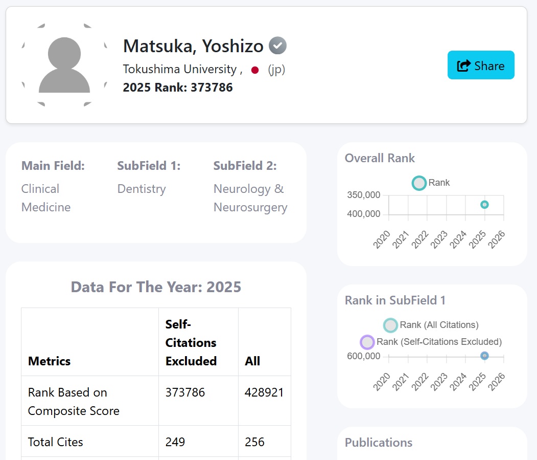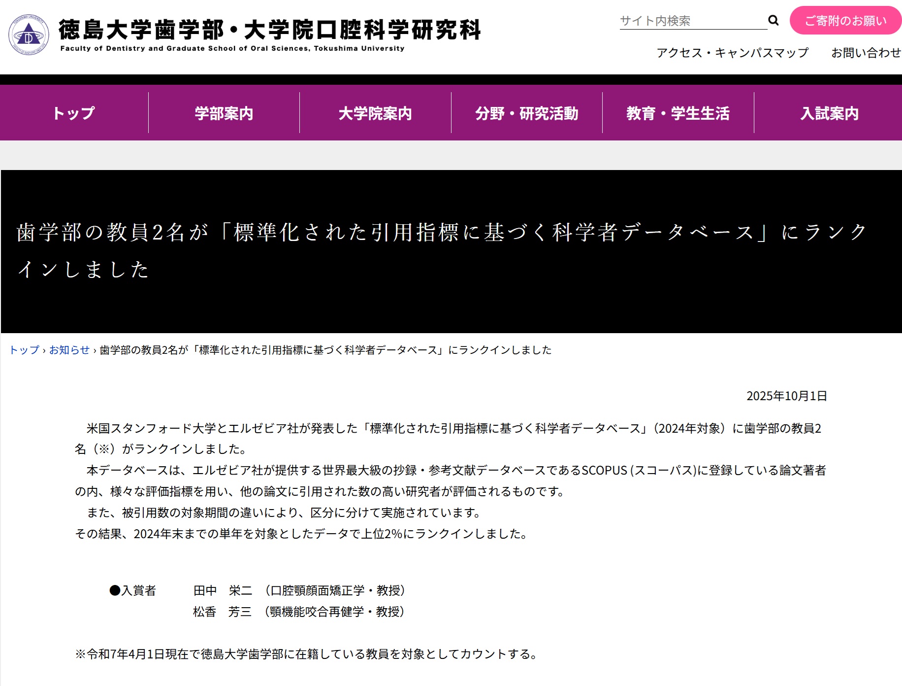 | 米国スタンフォード大学とエルゼビア社が発表した「標準化された引用指標に基づく科学者データベース」(2024年対象)において松香芳三先生がTop 2%にランクインしました。Dr. Yoshizo Matsuka ranked in World's Top 2% Scientists Network (2024) released by Stanford University and Elsevier(2025年10月1日) | |